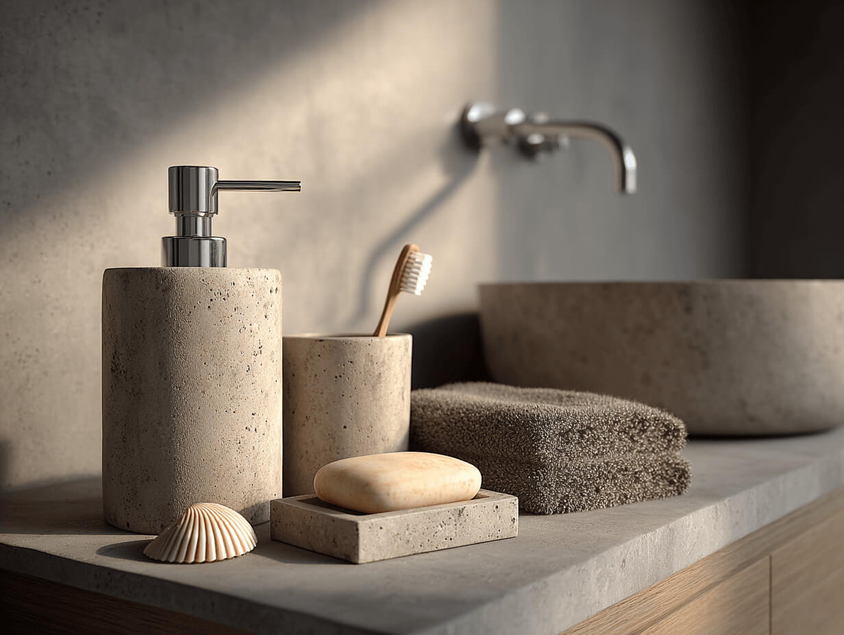 Ещё один популярный приём — использование нескольких бетонных аксессуаров одновременно. Дозатор, мыльница и стакан для щёток, выполненные в одном стиле, создают аккуратную композицию. Такой подход делает интерьер более продуманным и визуально завершённым.
